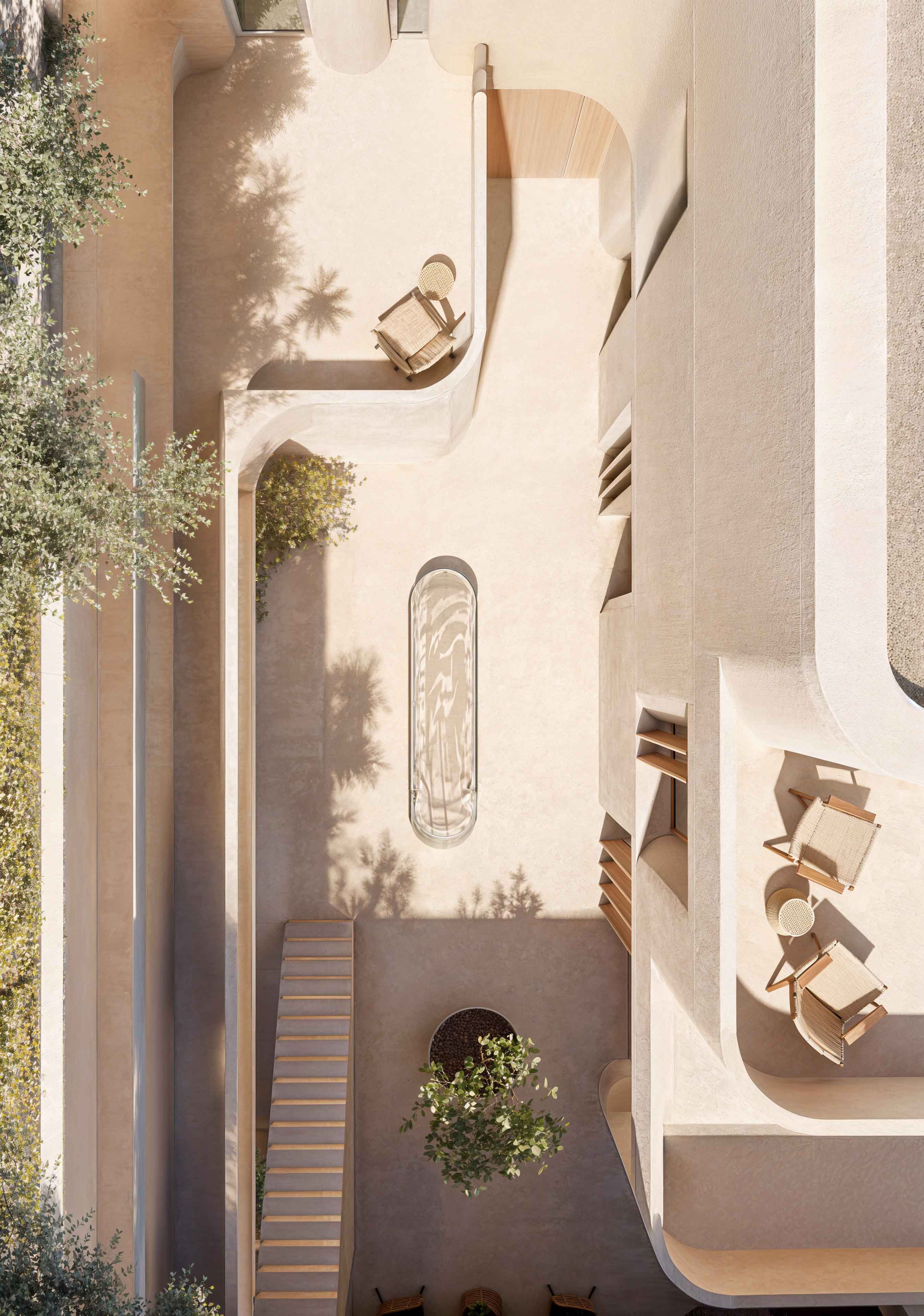 At the heart of the design is a central courtyard, a timeless typology that brings natural light, ventilation, and privacy into the home. Framed by curved, 3D-printed walls, the courtyard becomes a place of calm, softened by native vegetation and a water feature that together ensure comfortable use throughout the year. A sunken living room subtly defines zones without relying on solid partitions, creating openness and visual continuity across the ground floor. A majlis with a dedicated entrance and bathroom honors traditions of hospitality while maintaining the privacy of the rest of the house.